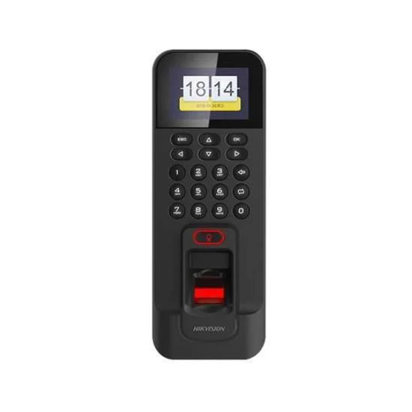 System ParametersFingerprint Recognition Duration:1:N recognition duration (Up to 1000 fingerprints) < 1 sOperation System:LinuxFingerprint Module:Optical fingerprint moduleStorage:1,000 users, 1,000 cards, 100,000 eventsFRR (False Rejection Rate):≤0.1%Card Reading Distance:0 to 5cmFAR (False Accept Rate):≤0.001%Card Type:M1 CardFingerprint Capacity:1,000Device InterfacesCommunication Mode:Ethernet 10/100Mbps self-adaptive; EHomeOutput Interface:Doorbell×1, Relay×1Input Interface:Exit button × 1, door contact × 1USB Interface:USB2.0GeneralSSR(Self Service Reports):Stand-alone operation, calculate attendance data and export reports via USB interfaceLCD Screen:2.4-inch (320×240 LCD-TFT Display Screen)Key Board:Physical Keys (No Back Light)Power Supply:12 VDC/1 AAudio:1 Buzzer and 1 LoudspeakerInstallation:Wall Mounting with/without Gang BoxWorking Humidity:10% to 90% (Non-Condensing)Working Temperature :-10° C to 55° C (14° F to 131° F)Dimensions (L×W×H):140mm × 155mm × 30mm (5.51" × 6.01" × 1.18")